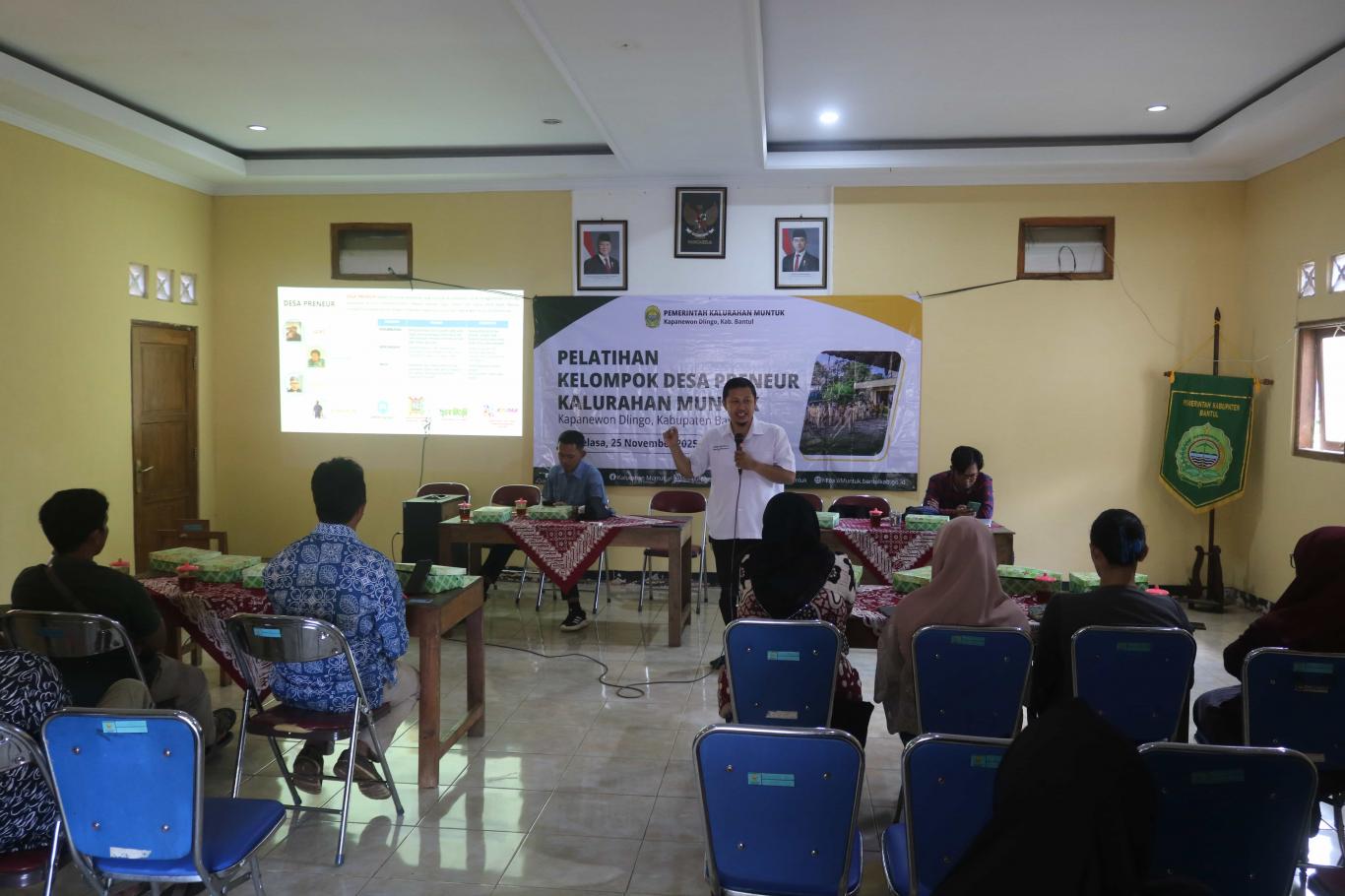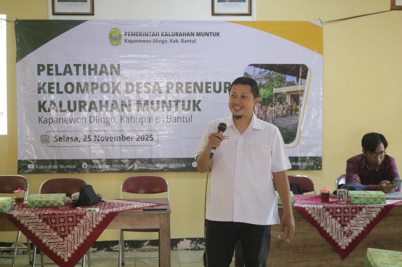 Kegiatan pelatihan yang dilaksanakan di Aula Kalurahan Muntuk ini diikuti secara antusias oleh seluruh anggota kelompok desa preneur. Pelatihan ini menghadirkan dua narasumber berkompeten dari instansi dan media yang berbeda, guna memberikan wawasan yang komprehensif.